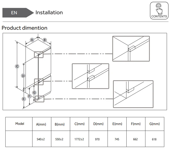 Candy ECNBQL3518EV beépíthető alulfagyasztós kombinált hűtőszekrény, 194/74L, 54x55x177.2 cm Low Frost Technology
